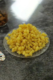 Boondi is tiny fried balls made from gram flour. This is broken down in a sugar syrup and made into super delicious balls of pure delight.