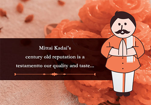 Mittai Kadai's century old reputation is a testament to our quality and taste. Our flavours and standards have given us a unique identity in the food map of the country. With such legacies in place, Mittai Kadai promises the best in every way plausible. Few irresistible qualities of Mittai Kadai include :